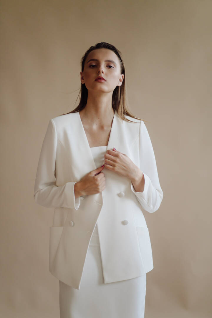 Двуредното закопчаване с контрастни тъмни копчета добавя класически акцент, а меката и гладка материя осигурява комфорт при носене през целия ден. Може да се носи както самостоятелно, така и комбинирано с рокля, панталон или пола.